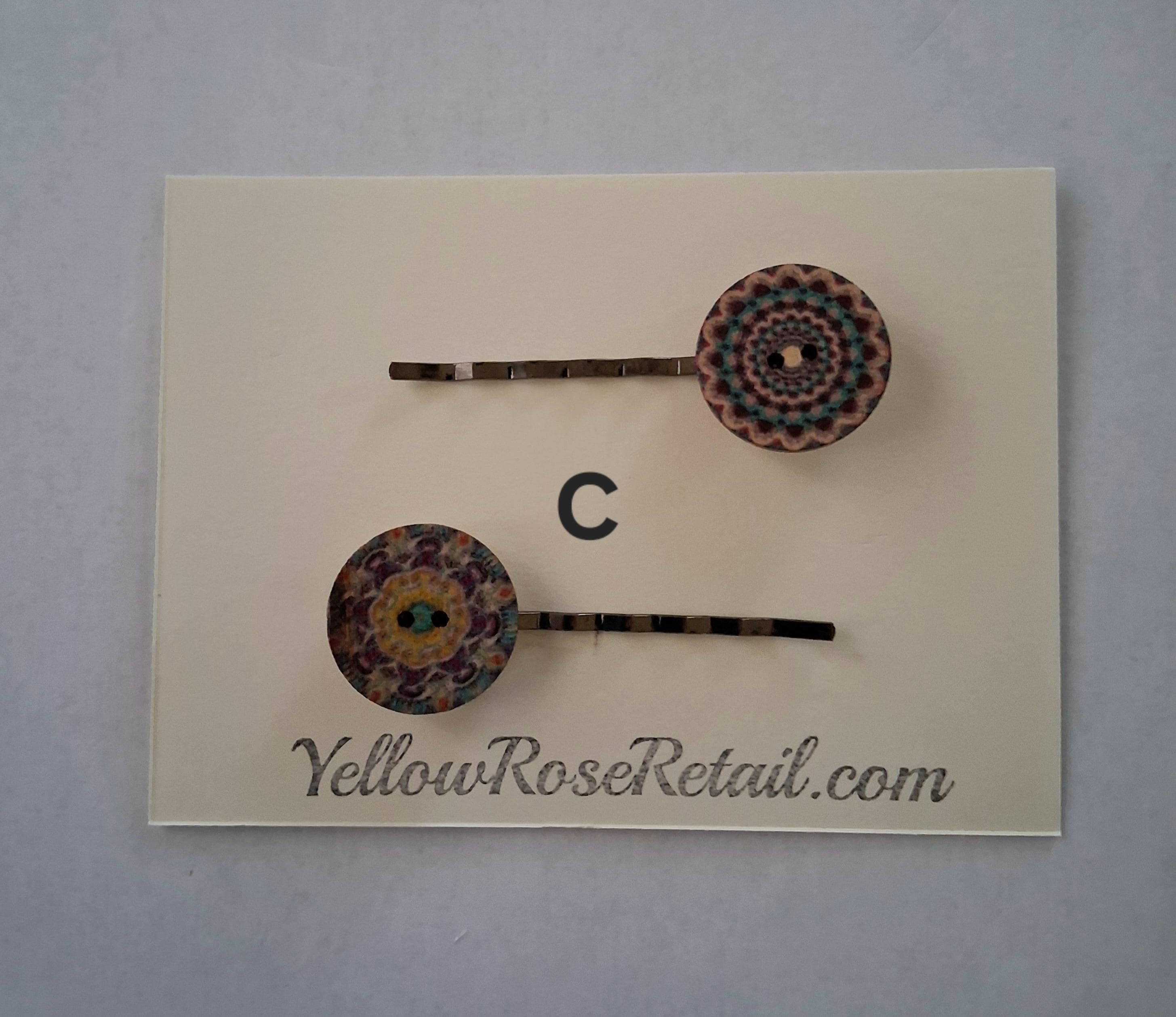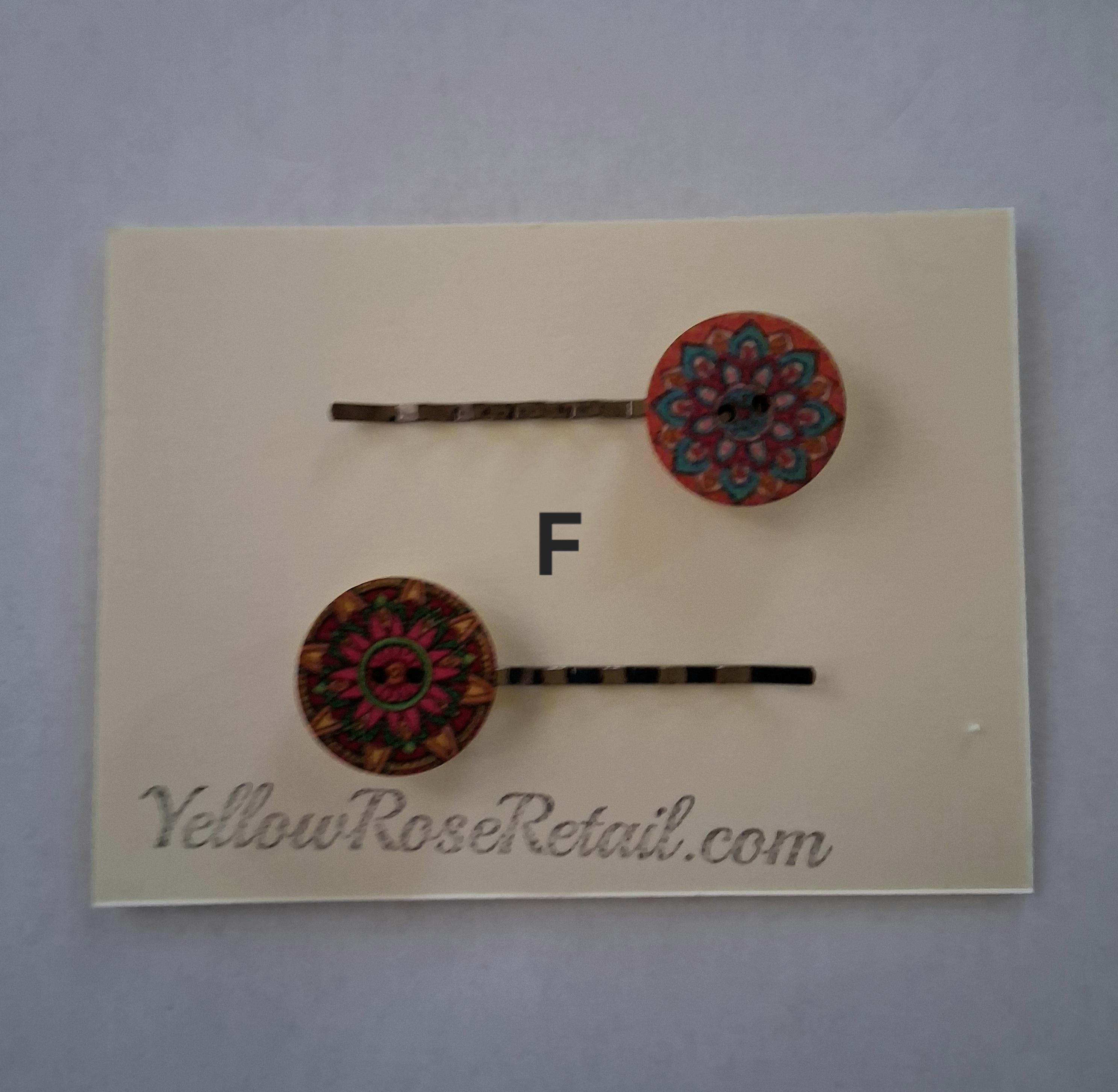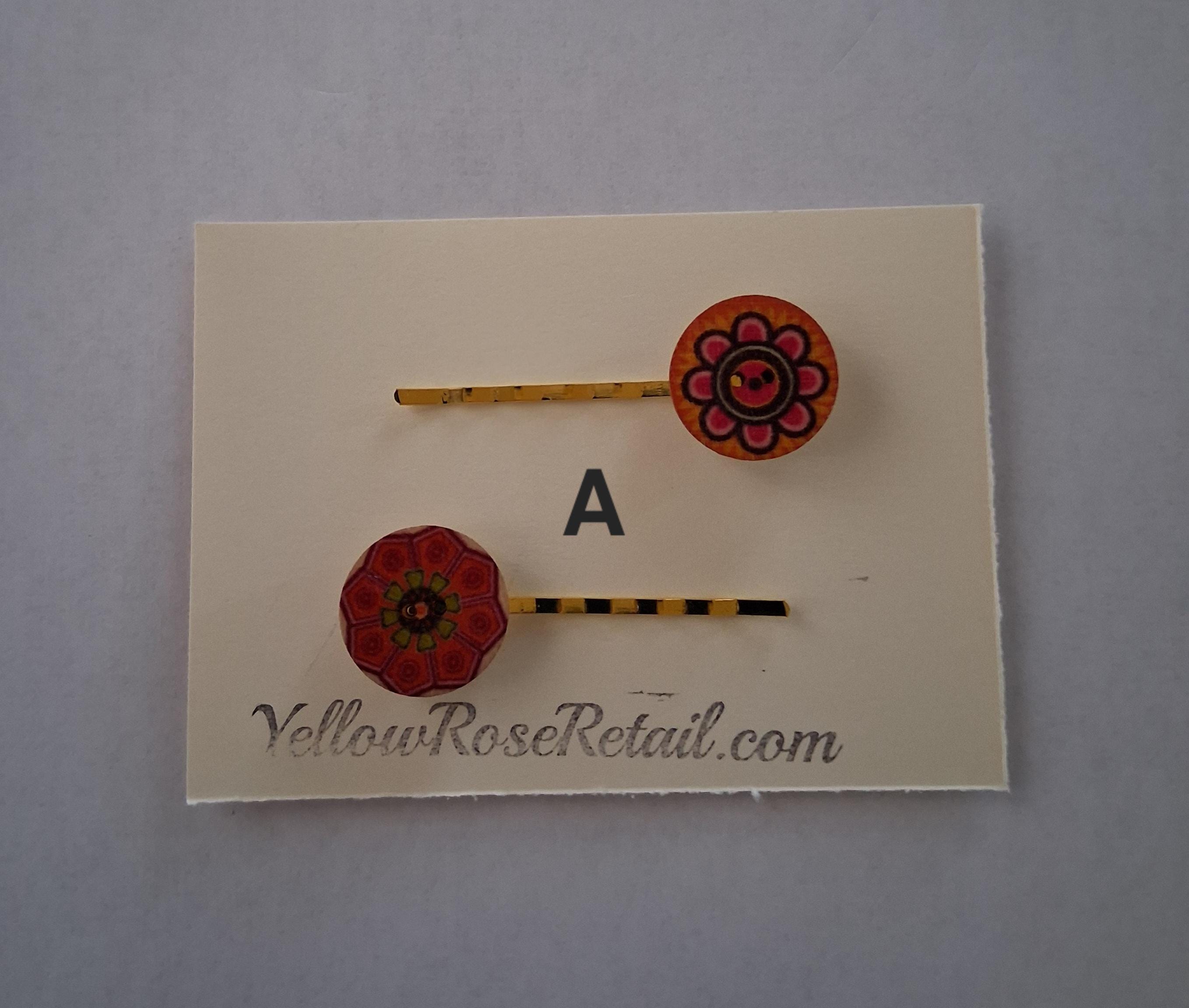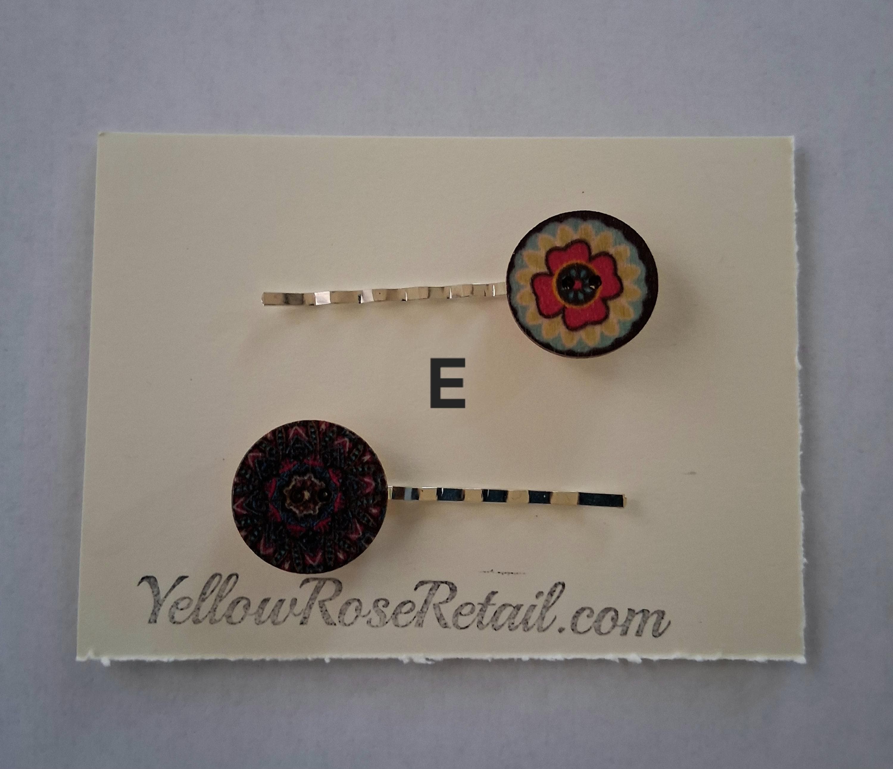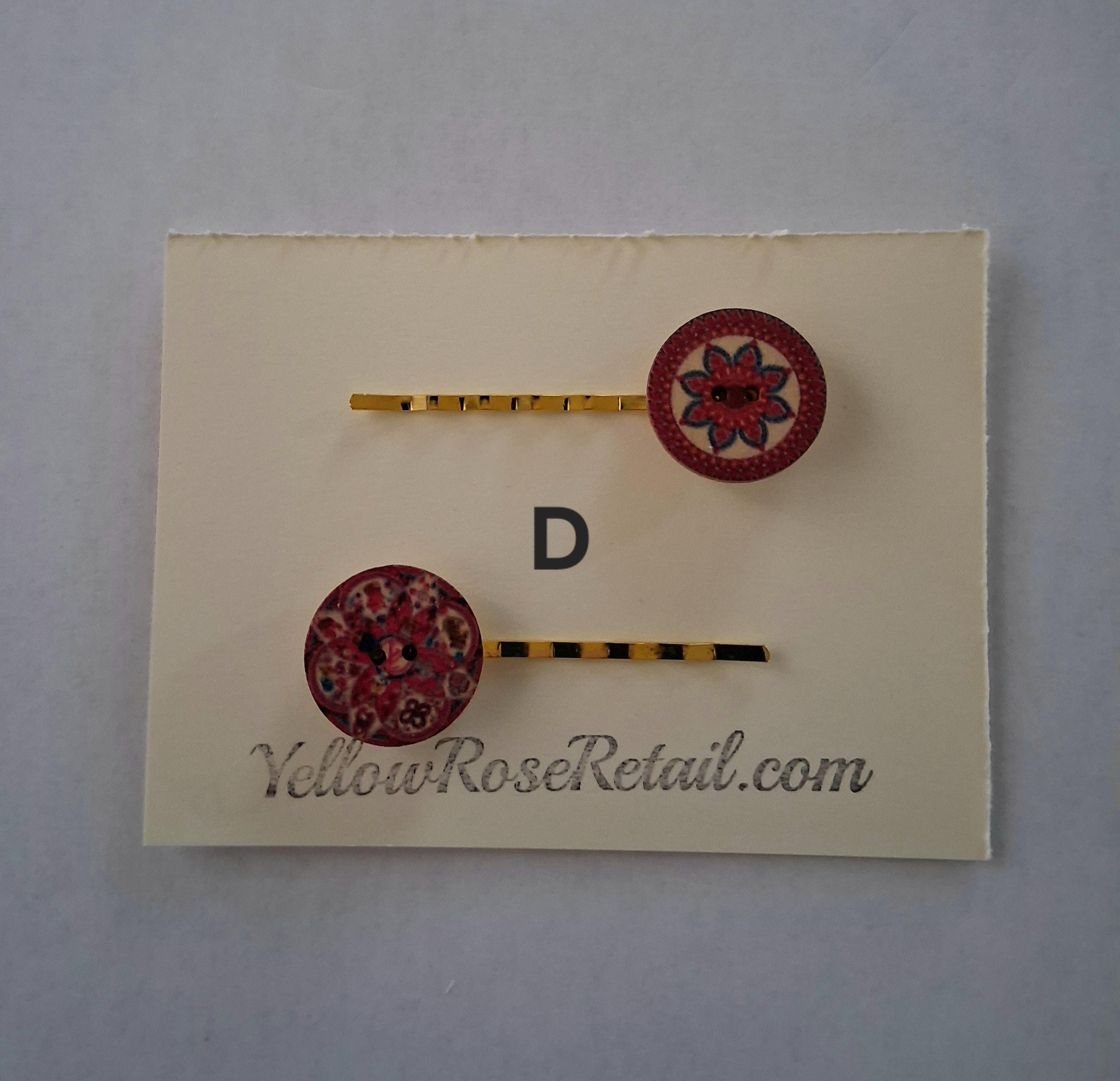 Vintage wood buttons in various prints adorn these bobby pins. They come in a set of two, seven sets to choose from.