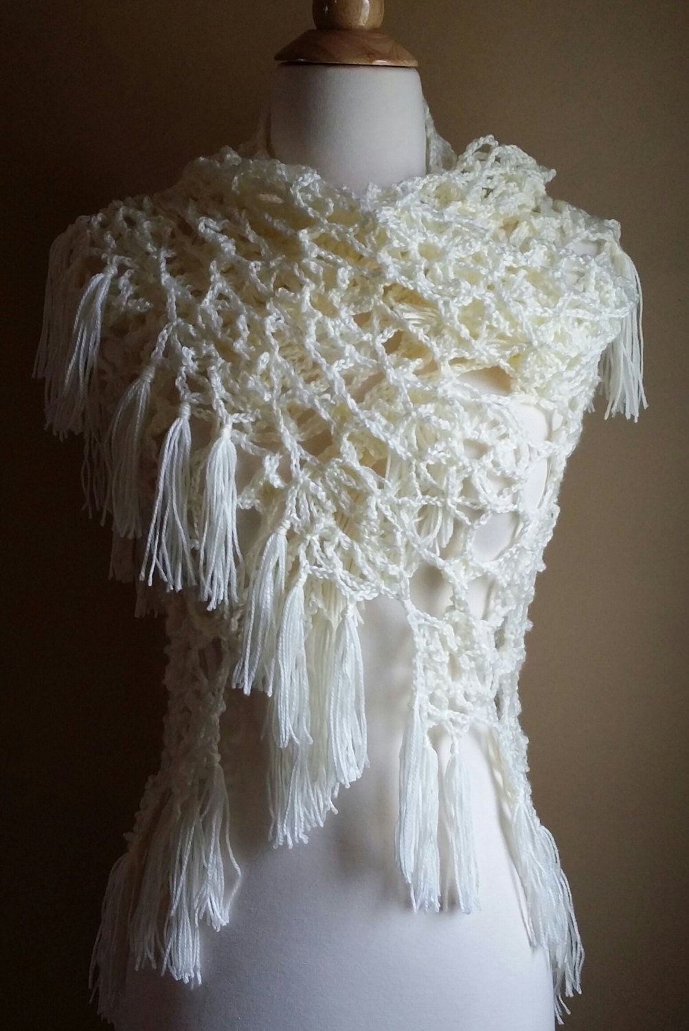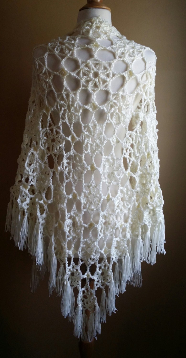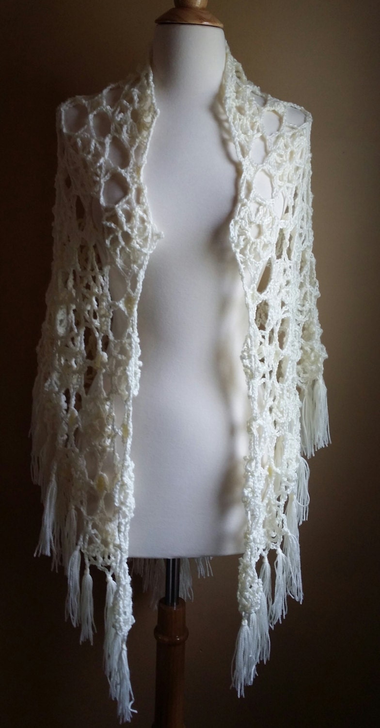 Ivory floral pattern crochet shawl/wrap, in soft acrylic yarn, with fringe. Perfect accessory for a wedding, or those cool summer evenings. Ready to ship, ships free!