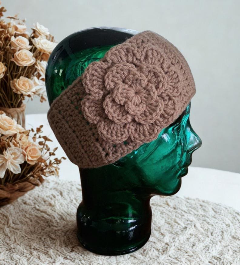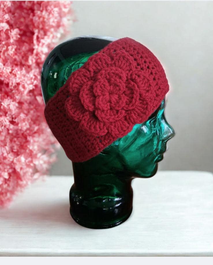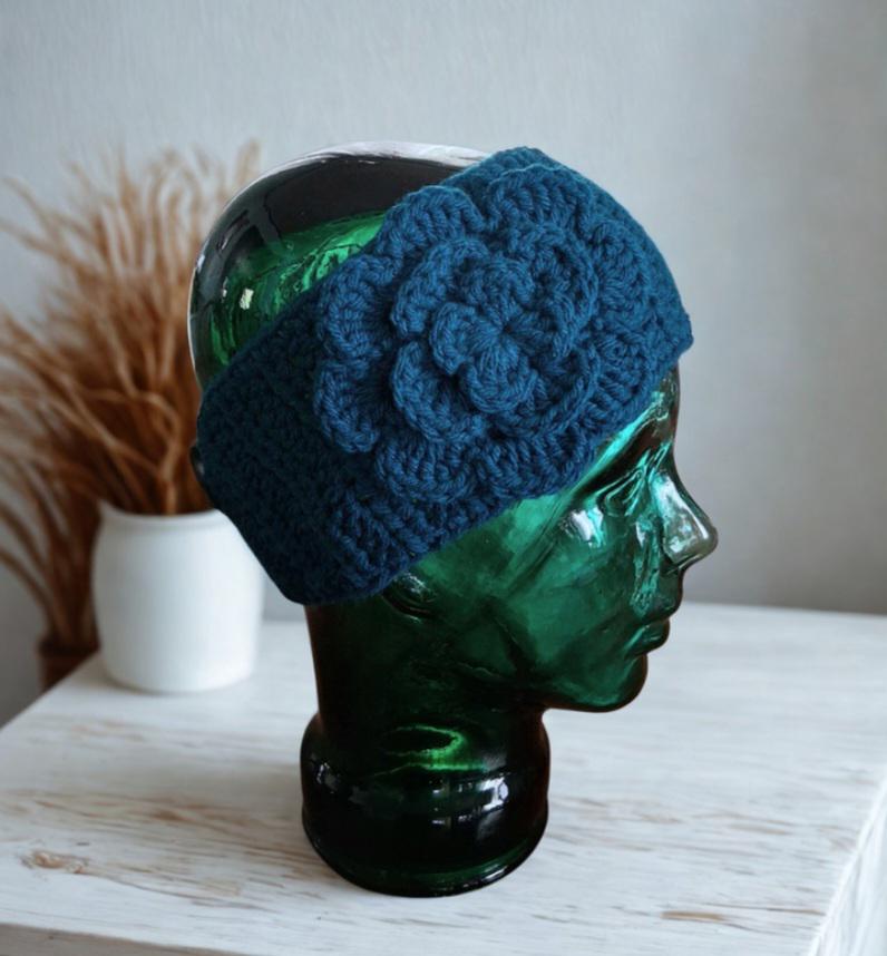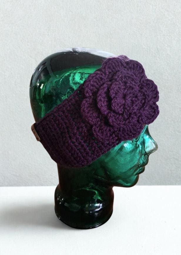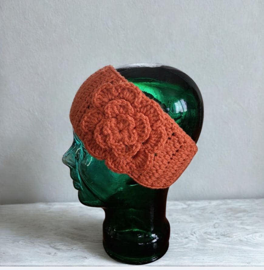 Womans crocheted flower ear warmer, with button closure. 7 colors of fall to choose from, gold, blue, cranberry, plum, pumpkin, and tan! Adult size.
